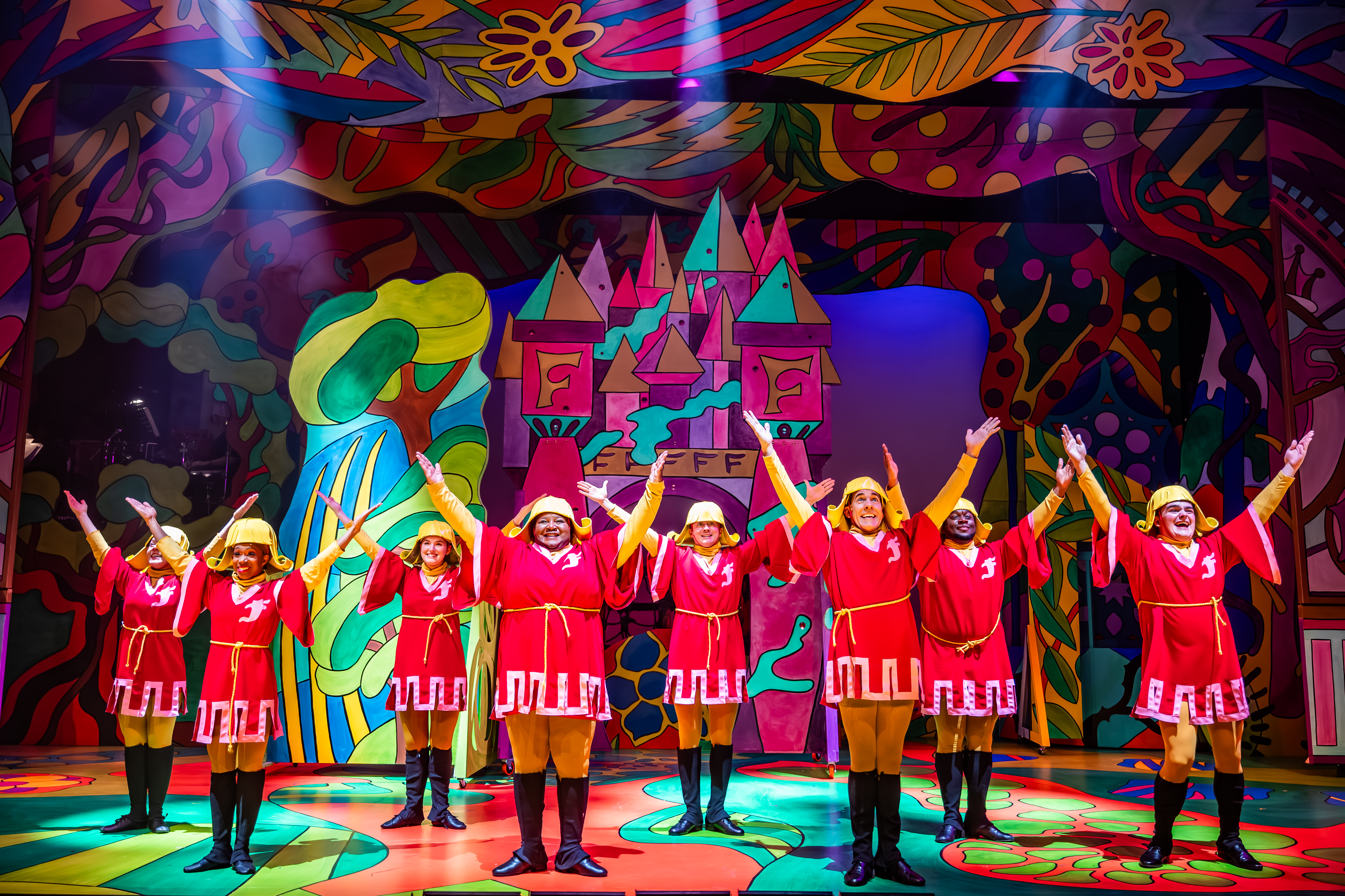 William Layton’s expansive and whimsical set design is dazzling; you can’t help but be amazed from the moment you walk into the theatre. With the colourful foliage not only covering the stage but also stretching onto the walls of the theatre space itself, Layton has entirely outdone himself. The multi-functionality of the set pieces is fascinating, making for quick set changes but also beautiful designs on both sides of the pieces, and I also loved the little hideaway in the trees for the live band! Unfortunately, Dragon doesn’t quite match the magic of the rest of the set; it’s like there’s a piece missing, it goes straight from the head to the tail section, looking more like a giant goldfish than a dragon. But the imagination can do wonders, and with the full lips and batting eyelashes, it certainly gives off similar vibes to the Dragon in the films. Joyce Padua’s costumes carry through many familiar themes and colour schemes from the original, while still making them unique and fun. Echo Zhou’s lighting design is spot on (pun intended) with quick colour changes or flashing lights to give us the full effect of Shrek’s rage or the hot lava outside of Fiona’s keep.
