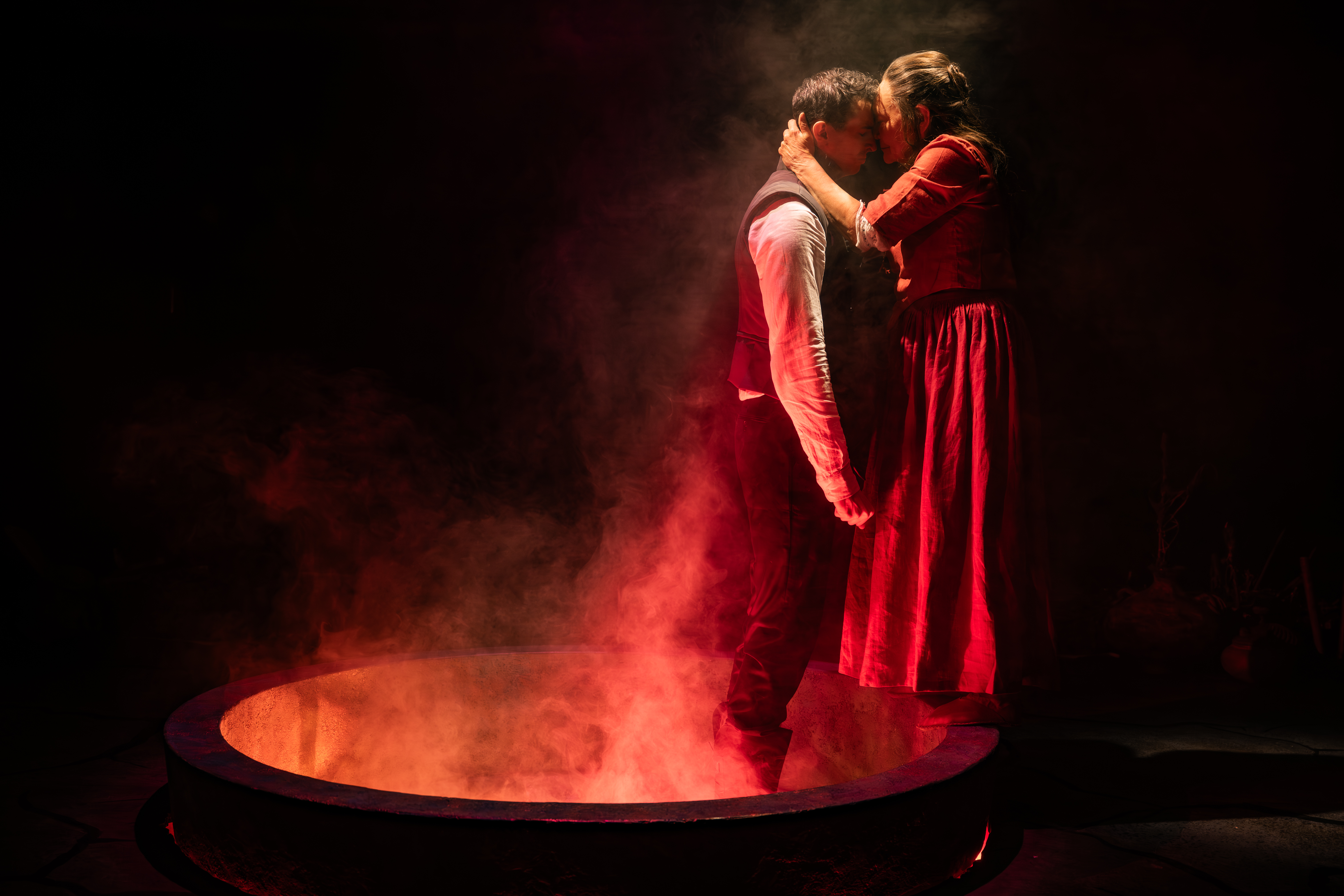 As Silverman’s text takes place between two worlds, Nick Blais’ masterfully designed set does as well. One end of the room is fashioned to be the castle, with velvet curtains, a lofty throne and an ornamental urn which is used in less appropriate ways than I had imagined by Sir Arthur. At the other end of the stage is Elizabeth’s hut; on the outskirts of society, it’s symbolized by ropes, furs, and plants, things of nature but also things of magic. In the middle is a large pit around which the characters cook, and dance. Along with Ting – Huan 挺歡 Christine Urquhart’s aforementioned period costumes and Jareth Li’s vibrant lighting design, Witch speaks to us through every element of its production.