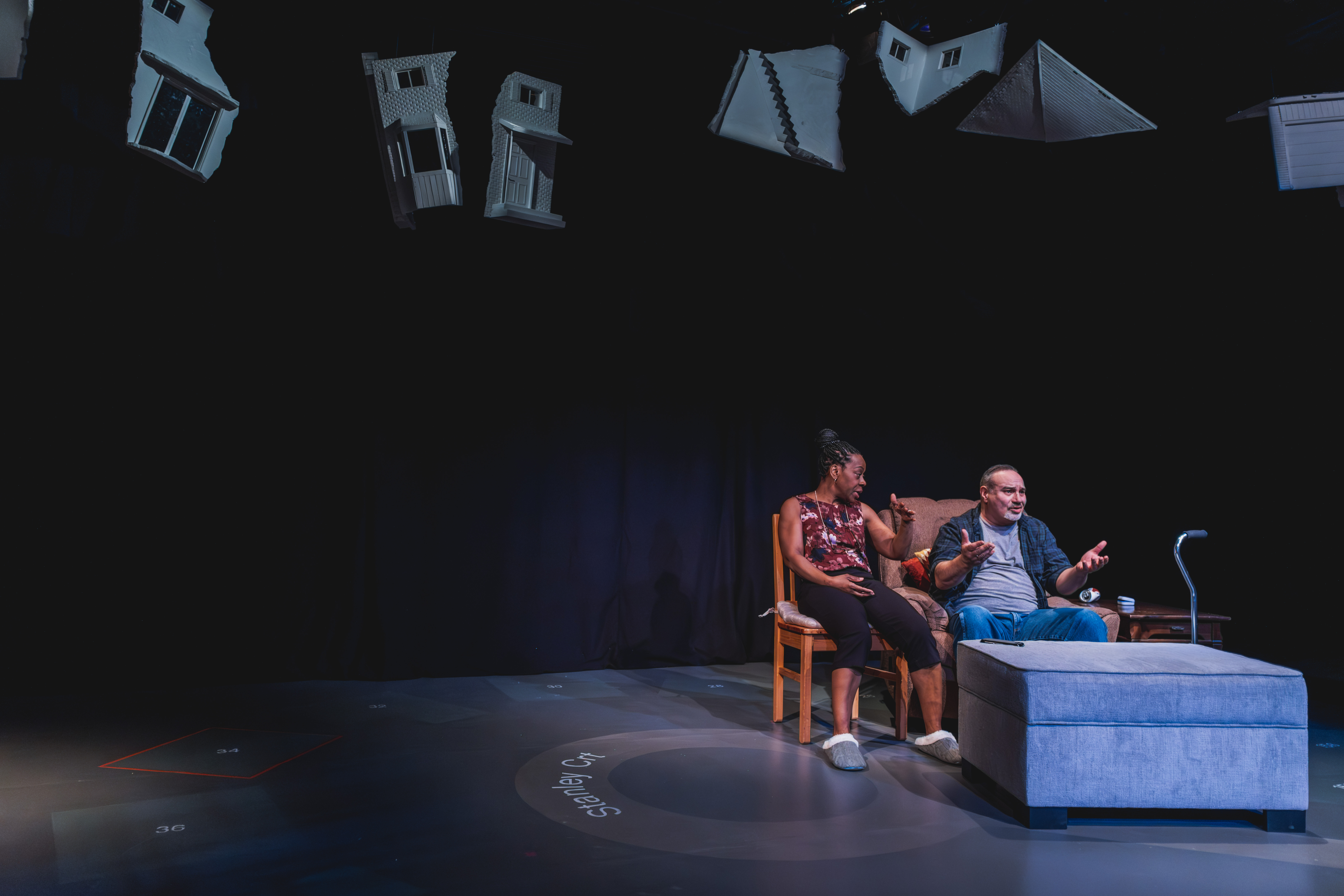 When you enter the theatre, Kelly Wolf’s set is already a feast for the eyes – a little puzzle you can put together as you wait for the action to begin. Hanging above the playing space is a deconstructed house: chunks of what would make your stereotypical suburban house with multiple floors and lots of windows, and a sturdy roof. The floor is a map of Stanley Court, a once quiet street which has suddenly become infamous. There’s a house outlined in red, while the rest sit peacefully along side it. Two living rooms are established on either side of the stage, and this is where we meet the Armstrong family and their neighbour, Au Yeung Wei.