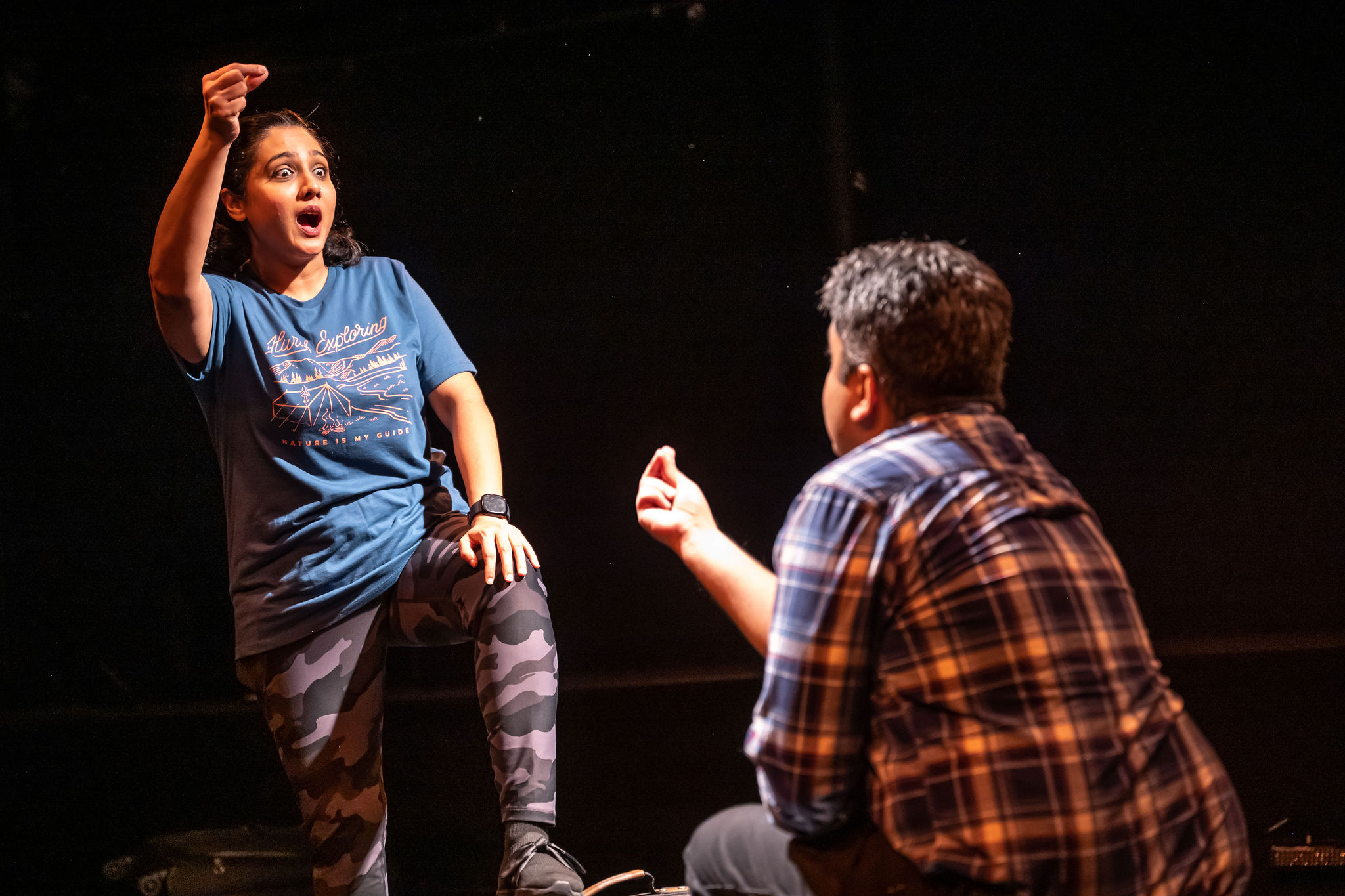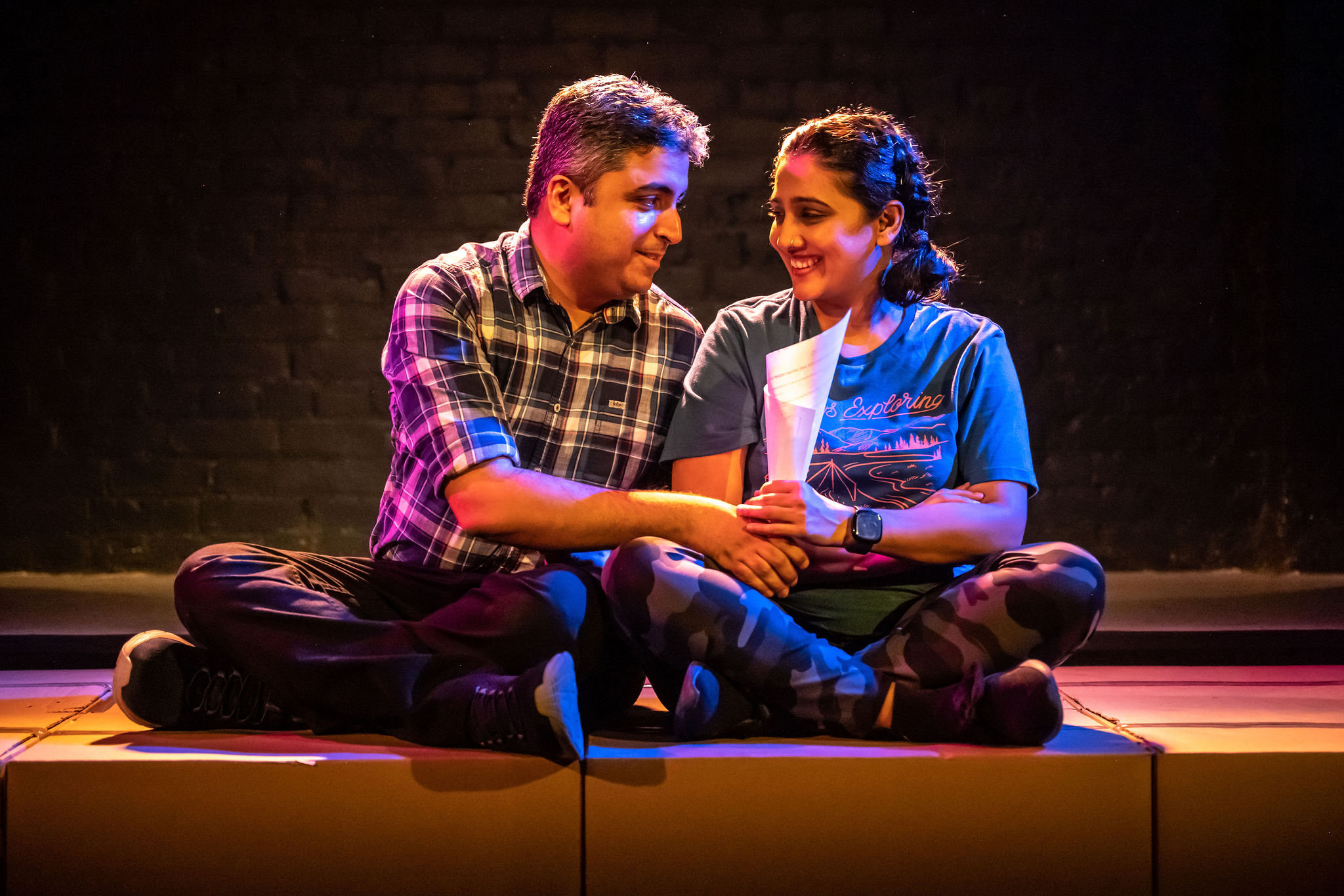 However, I think one of my favourite elements of this production came late in the play, where Neha and Himanshu have a full argument in Hindi – no subtitles, no explanation, and yet I didn’t feel like I needed any of that. From both of their performances it was easy to tell what was being said, or at least the feelings fuelling the argument. It felt so raw and true to have the emotional climax of the play be in their shared language, and it makes a powerful impact on the audience.