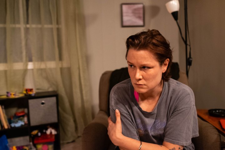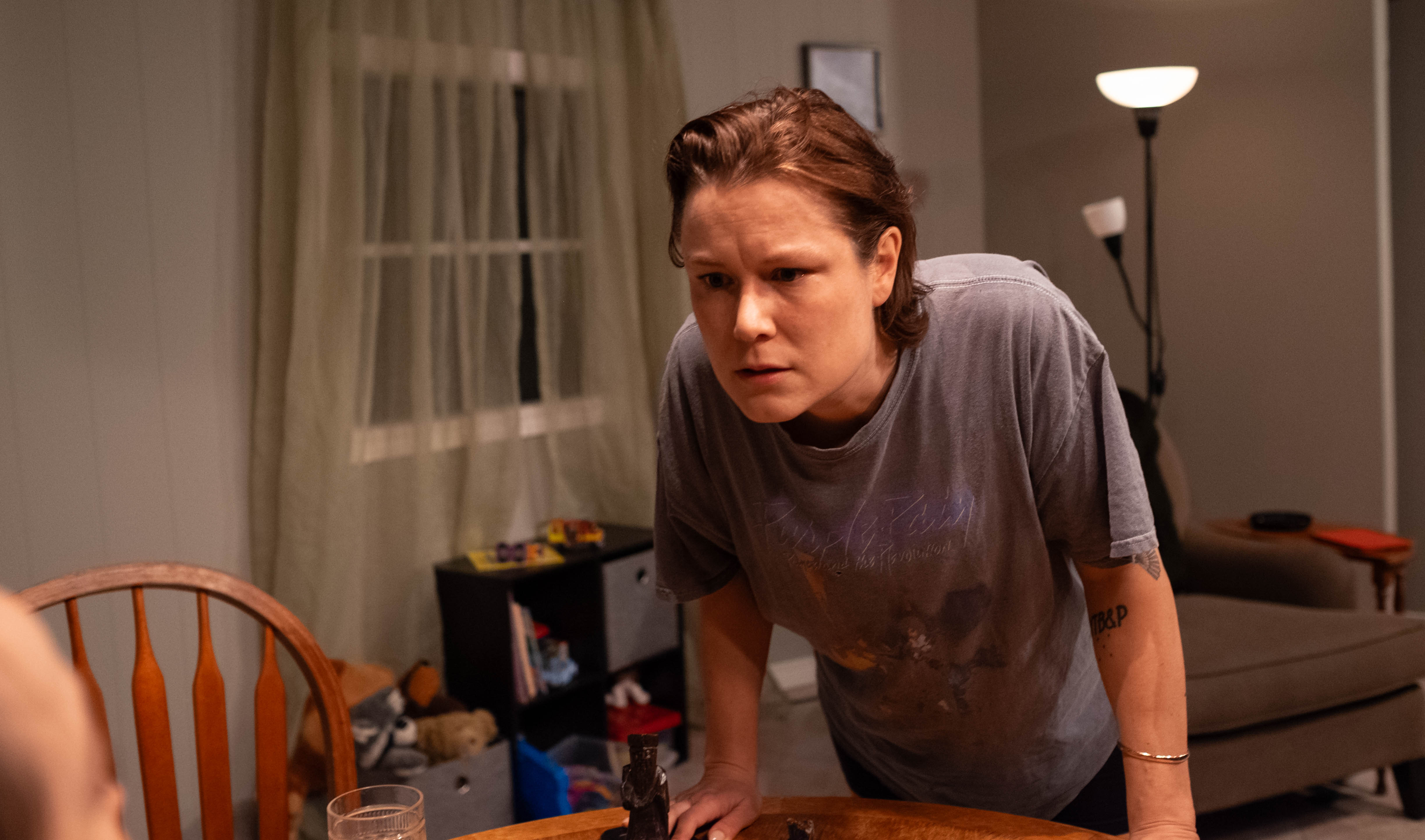 Amelia Mielke-O’Grady’s set design for Anywhere really does make it feel like anywhere; the light grey tiles with a darker grey wall make the room feel small, and the lack of art or unique furniture makes it feel like no one really lives there. Though the LEGO on the floor and cute sign denoting “Ethan’s Room” (with a little Pikachu drawn for good measure) certainly imply that there’s a child about. It is also a truth universally to be acknowledged that if the weight of an object on stage is noted, that object will later be used to bludgeon someone (though I won’t mention what it is, but this Chekhov’s gun approach fits the play to a tee). This almost claustrophobic setting perfectly fits the tension of the play; there needs to feel like there’s no way out for both the characters and the audience witnessing their actions.