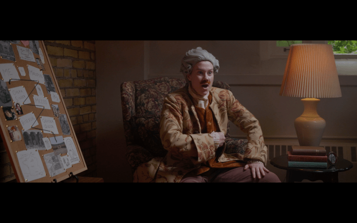 La Maupin takes place in a stately home which appears to be unoccupied. The narrator makes use of it to uncover as much as they can about Melle Maupin, with mannequins of period costumes, wigs, and cork-boards of information helping unravel key pieces of her life. There’s almost a sense of it being like a riddle they have to solve: what’s true? What’s fiction? Just who was this La Maupin? In the section where the narrator discusses d’Aubigny’s first love affair, an overhead projector is used to display graphics and even little animations of a duel – I loved this now retro artifact being used in such an ingenious way for the movie, it gave that section a sense of fun and levity.