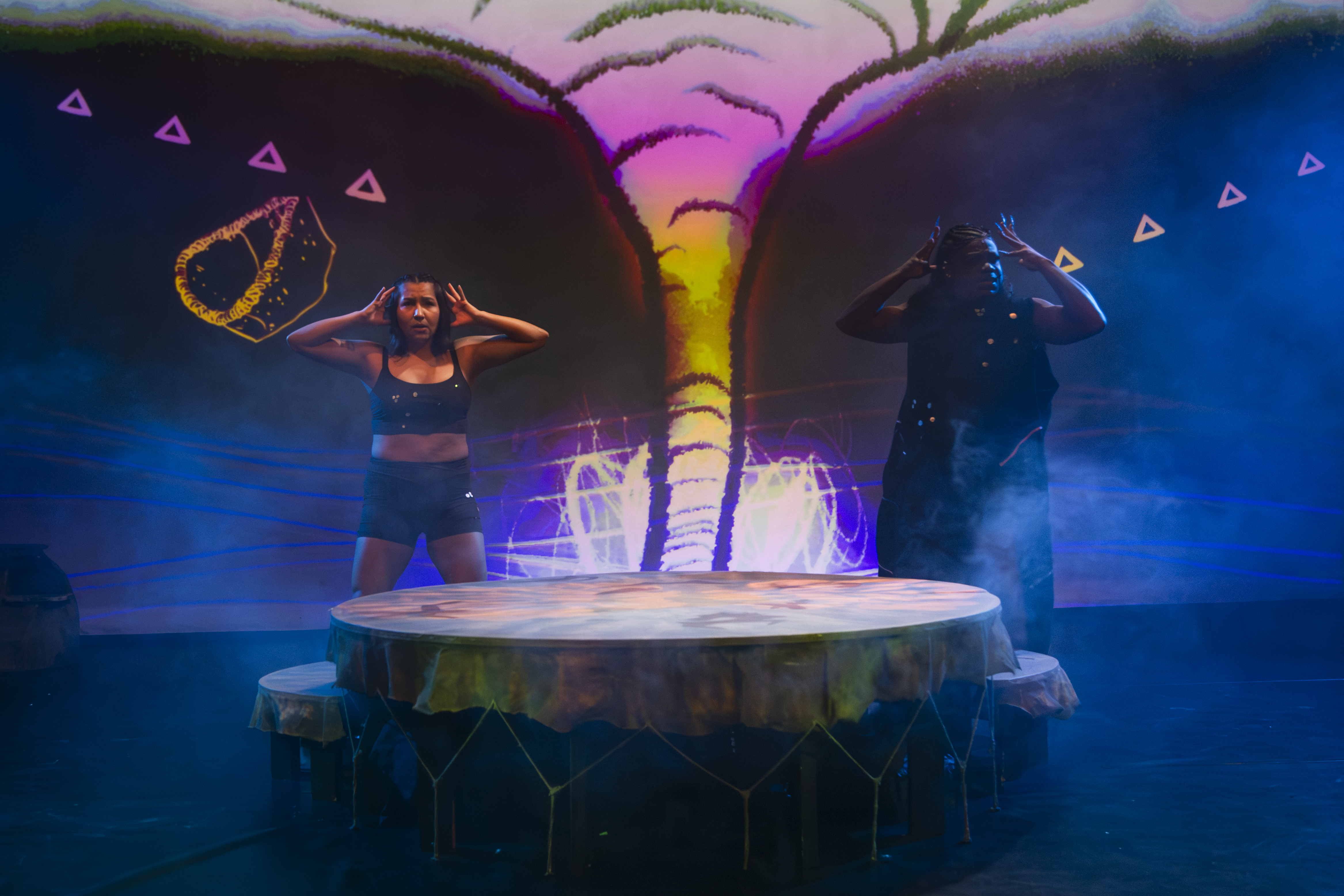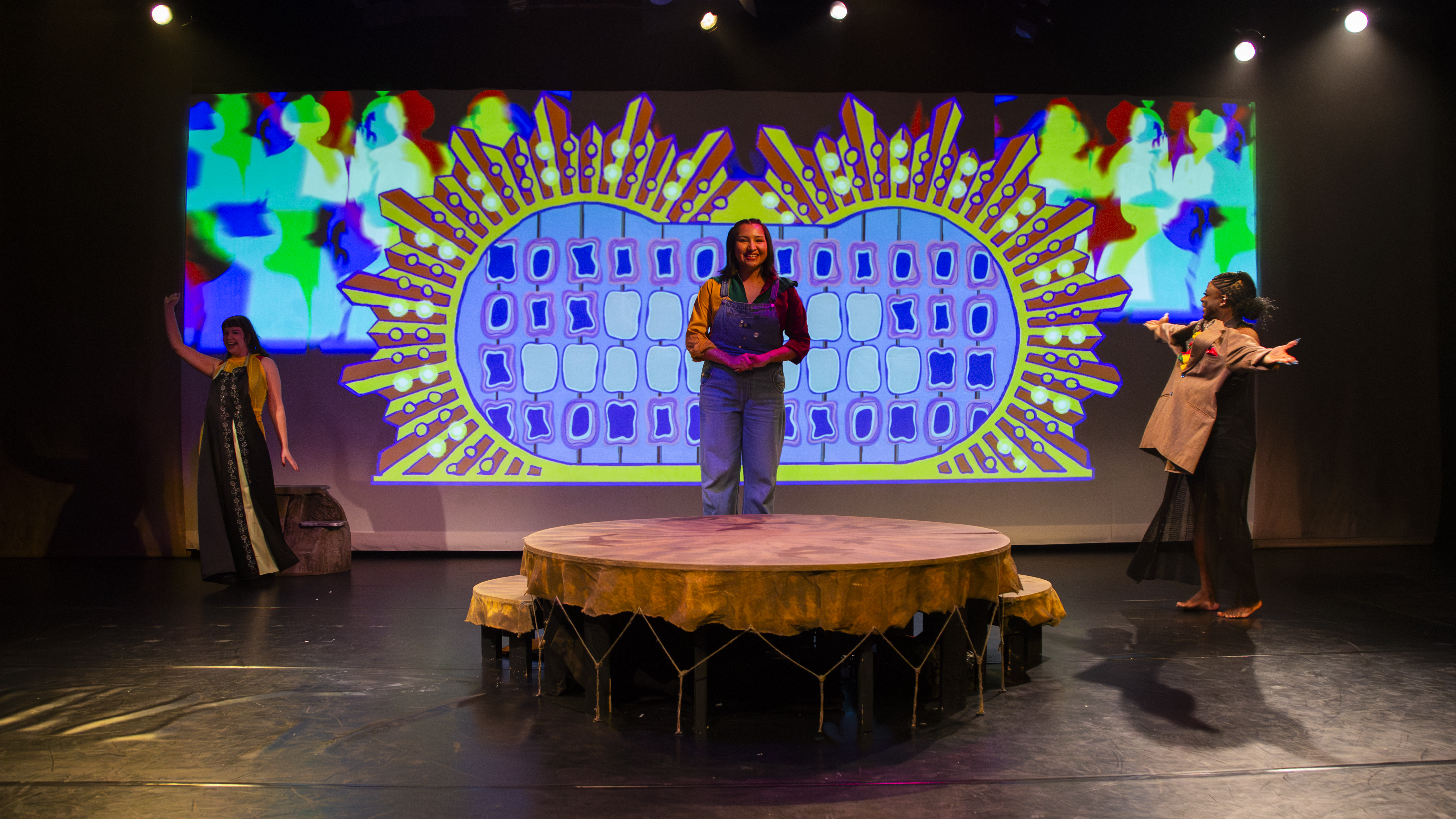 In the middle of the Aki Studio Theatre sits a large drum, with the three performers jauntily sitting atop it, welcoming in the audience as they head to their seats. Projections of Bonnell and Katia Ferderber, Miskozis past and present, light up the far wall. Trevor Schwellnus’ set design is beautifully symbolic while also being surprisingly functional. Sitting on three sides of the drum, the audience becomes a part of the drum circle, of the storytelling which is about to occur. Rihkee Strapp’s animations and video design, created with Schwellnus, provide much of the visual nostalgic elements, while also helping to explore the more mystical elements of Miskozi’s journey.