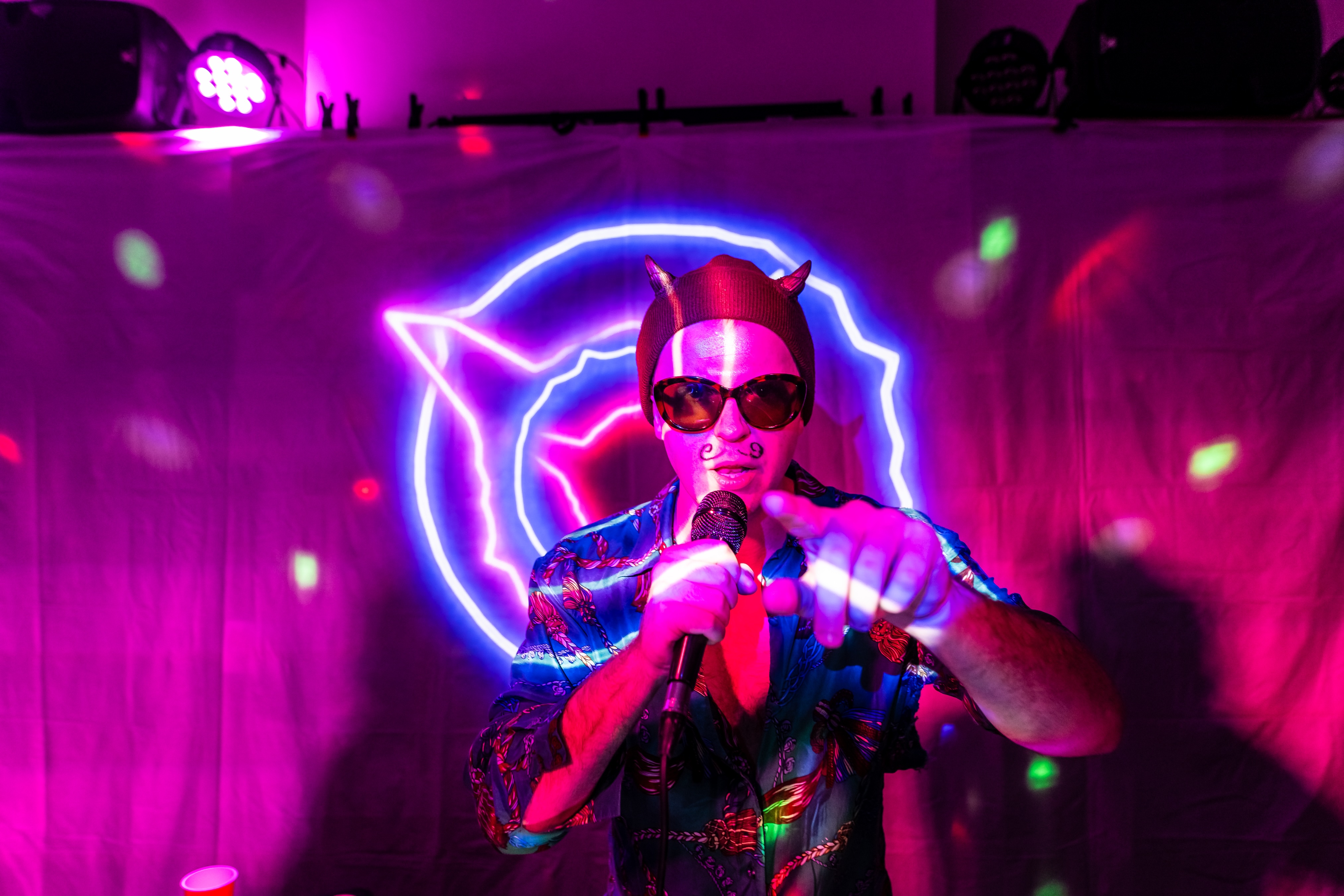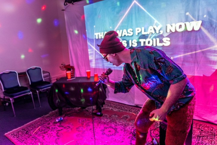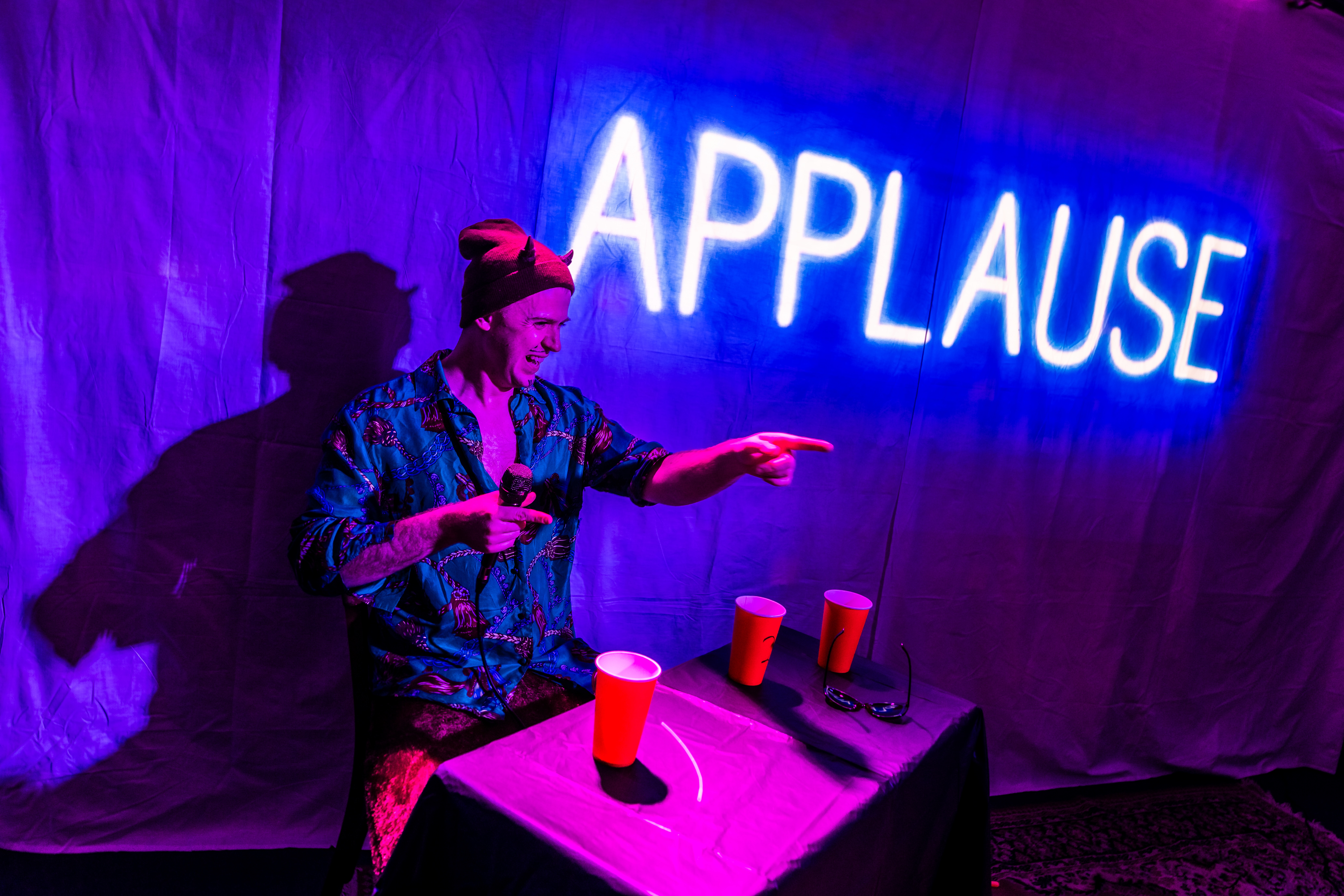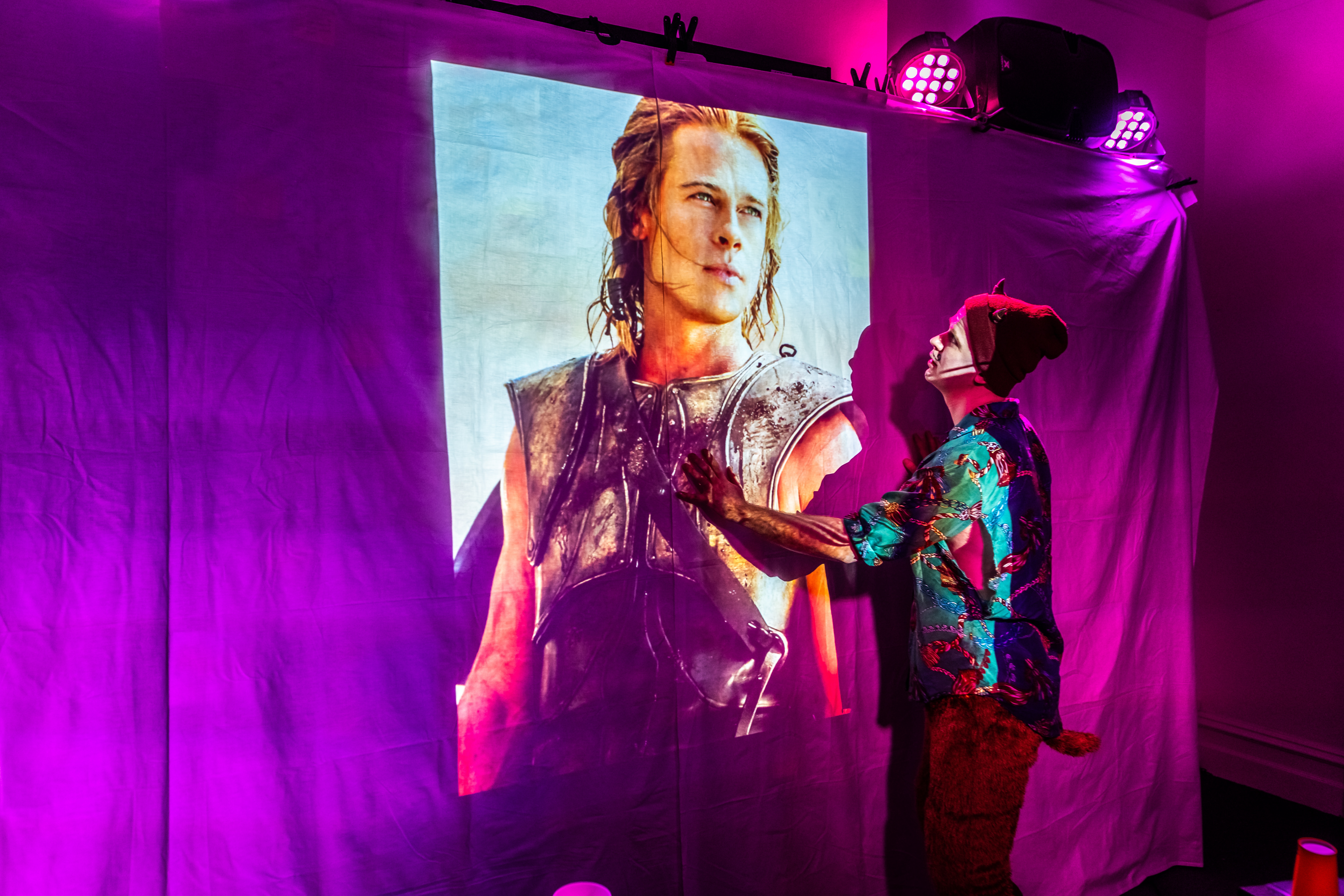 Once again, Talk is Free Theatre has created an immersive environment for audiences to experience their work. When you enter into the main playing space, there’s the detritus of a house party, complete with a karaoke speaker, disco ball, and an alarmingly long dildo amongst the trash. Oh, and a satyr sprawled out in the middle of the floor, sporting furry goat legs, a funky patterned shirt, and horns poking through his beanie.