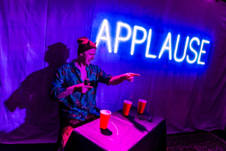 However, he does not do so fully on his own. Cyclops involves a great deal of audience participation. There are times where we read the lines of the other characters, both as a chorus and individuals, as well as critical points where we get to decide as to how the story goes. I was lucky enough to sit right up front on the very comfy sofa and I was asked to be in control of the disco ball at the top of the show, as well as playing a pitifully bad round of one-eyed beer pong. Due to these interactive elements, the show can change every time you see it, inviting multiple viewings. Now, if you don’t want to be interacted with, you’ll definitely want to take one of the seats at the back, but hopefully you’ll still have some fun shouting along a line or two!