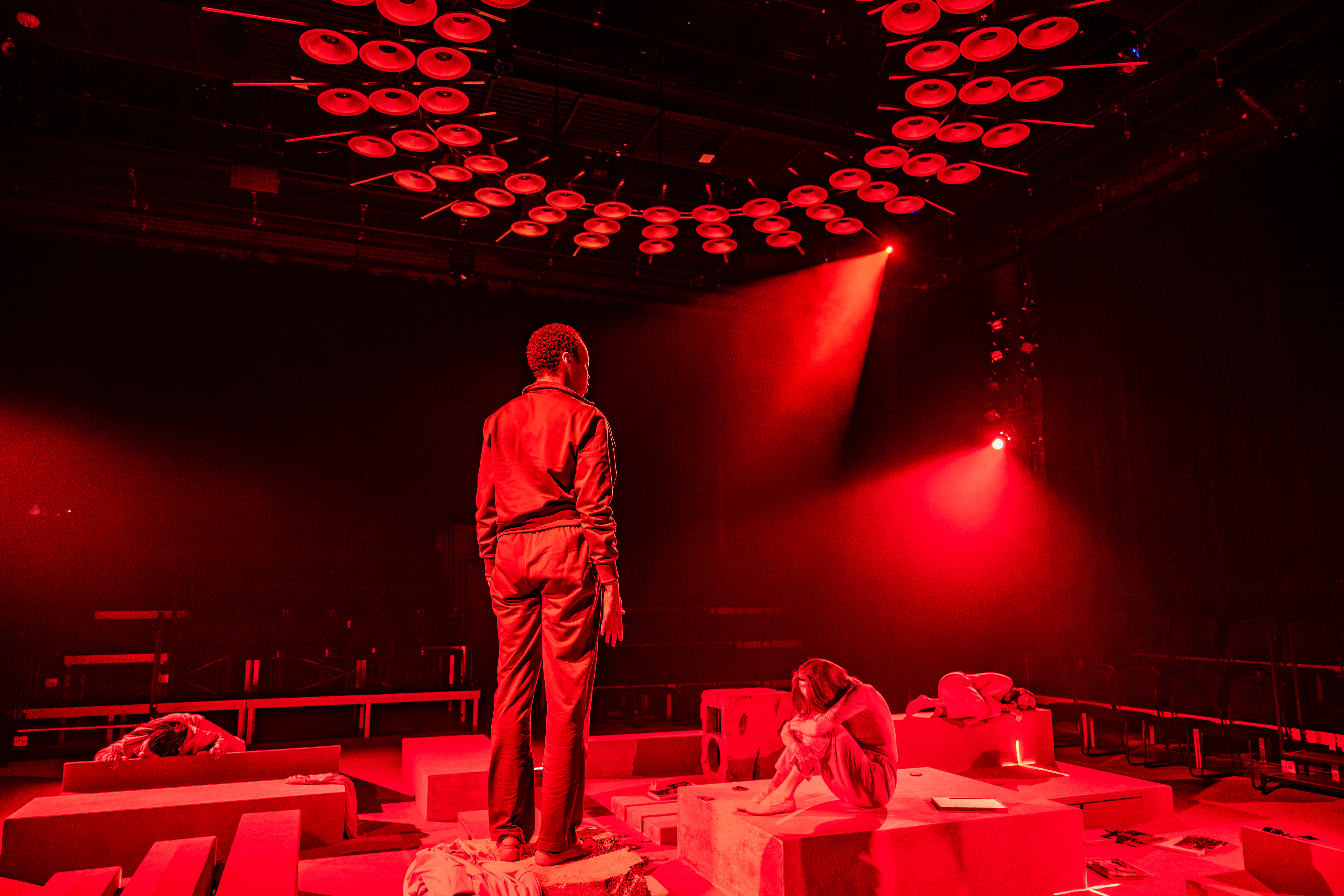 Red carpet covers everything on stage, save for the stones which are a constant reminder of the hot and rough terrain these women are going to traverse. Carved into the floor are crosses, though most are partially covered by the various risers and steps which make up the set. Moi Tran’s set design evokes the blood which haunts the bible stories. While there might be something to be said for staging this play in a proscenium to mirror one of the most recognizable images they use within the play, the in-the-round configuration of this world premiere allows for an intimacy which befits the material. The costumes, however, feel incongruous to this: athletic jackets with body suits underneath have a jarringly modern aesthetic, while also making it more easy to confuse the Mary’s. While the latter part is likely by design, the style in general felt out of place to the story.