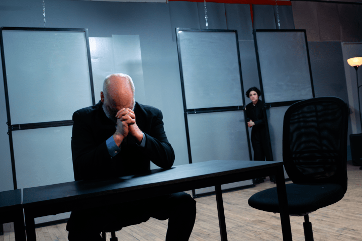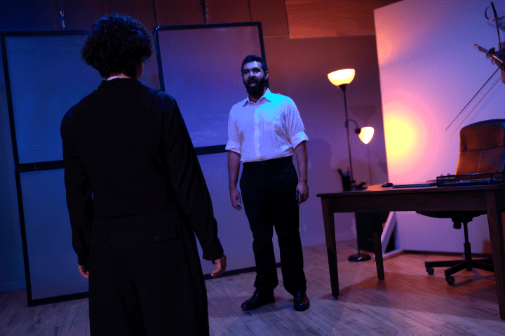 Hamlet, Sweet Prince sets Shakespeare’s tragedy in a posh, modern office, with set design by Kenzia Dalile and haunting lighting design by Franco Pang. The rapiers on the wall, acting as Chekhov’s rapiers, are the only vestige of the original setting of the play. This modernization of Elsinore doesn’t distract from the story itself, as the power structure of a modern company easily mirrors that of a kingdom. Ellyn O’Keefe’s costume design likewise keeps the integrity of the original, with Hamlet donned all in black while everyone else is back to business as usual.