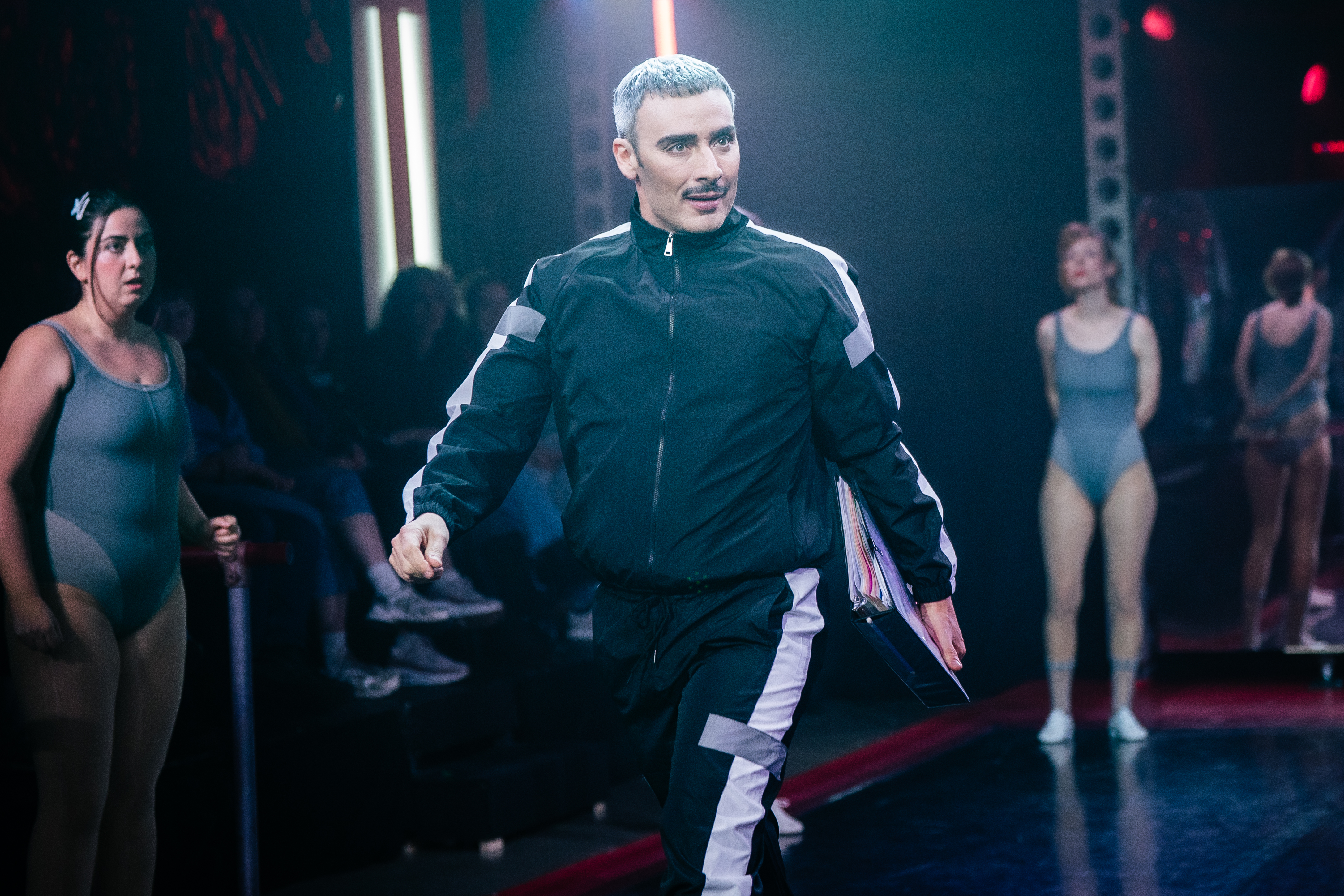 Dance Nation is making full use of the Coal Mine Theatre and their new upper space, The Vault. Act One of the play takes place in a runway formation on the upper floor, and then at the beginning of intermission, two crew members divide up the audience and take us down to the Coal Mine’s mainspace, which has been transformed to an in-the-round style, featuring Outside the March’s new, and very comfortable, seating. Nick Blais has truly outdone himself with these sets: both of them feel immersive and dazzling with the different configurations. The Vault is primarily used as the dance studio, with mirrors on all four walls and a shining black floor. The mainspace has been converted into a forest with foliage covering every inch of the stage and even the ceiling. It’s a stark difference, and yet that change is certainly marked in the story. Kathleen Black has created incredible costumes for this production, including a giant lobster which is worn by Oliver Dennis and has you laughing right off the top of the show. These glittery, gorgeous outfits are countered by the more tame practice body suits, but I also loved seeing how these characters dress outside of their dance lives.