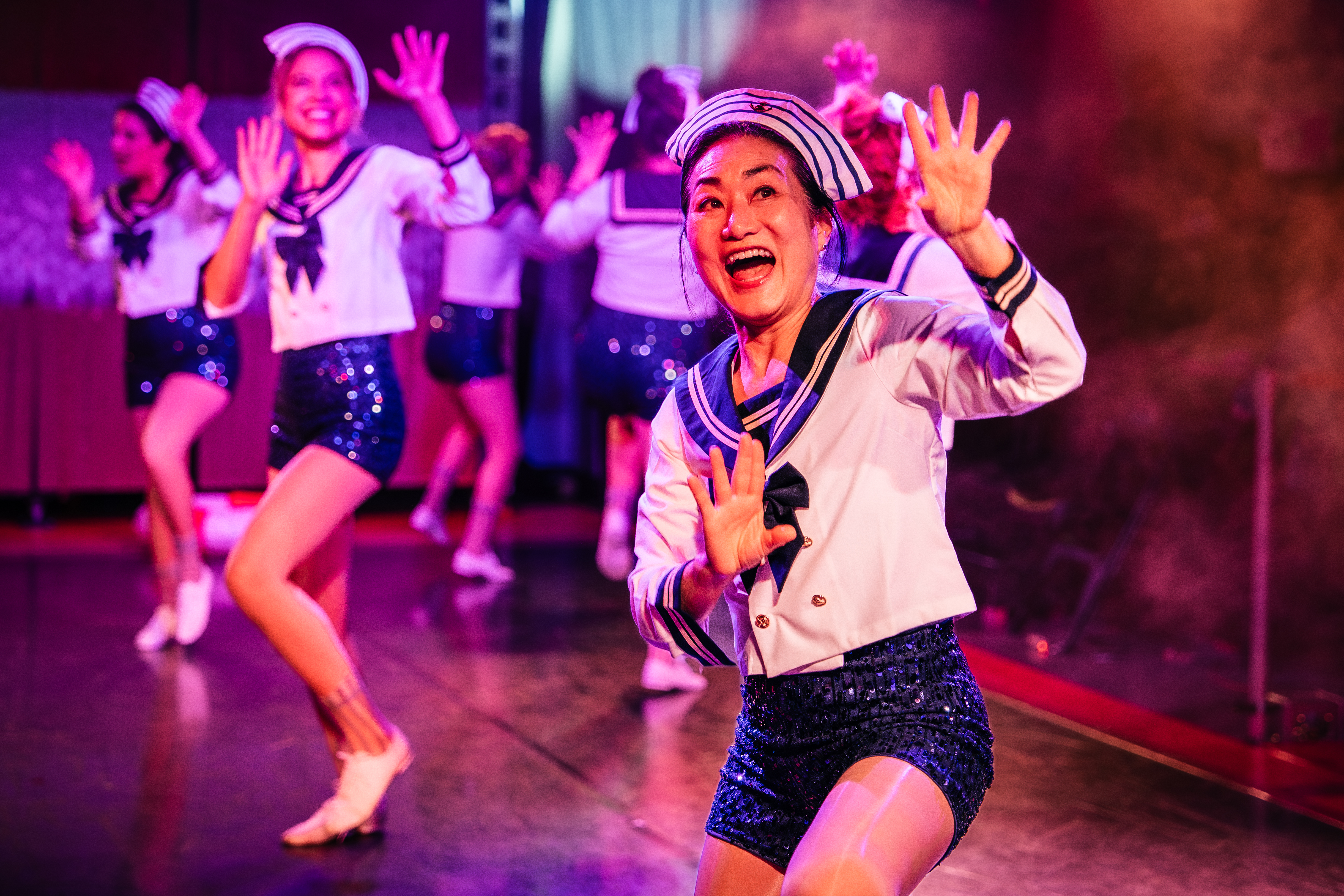 I could not imagine a more perfect cast for Dance Nation than the folks Coal Mine have assembled. Beck Lloyd is elegant and poised as Amina, while also giving her an emotional side we fall in love with. Amy Keating uses her full tenacity and power as Ashlee; her monologue in particular took my breath away. Annie Luján’s Zuzu is earnest and yet full of so much self-doubt, and Luján makes you want to cheer for Zuzu the whole way along. Jean Yoon’s Sofia is sweet, yet you can tell that she doesn’t mind being the one to stir the pot. Zorana Sadiq plays Connie who, along with her lucky horse, is clearly trying to do her best despite feeling on the outs with the rest of the girls in her class. Oliver Dennis’ Luke steals your heart; as the only boy in the class, and with his eyes set on Zuzu, you just can’t help but adore this kind young man. Katherine Cullen is perfectly unhinged as Maeve; she brings the chaos in the best way possible and I love how intense Maeve comes across. Dance Teacher Pat is embodied by Salvatore Antonio, whose cheek bones are as sharp as his attitude. Amy Matysio plays “The Moms”, as in everyone’s mom at one point or another. I loved the parts where she went full “Dance Moms” level mom as Zuzu’s mother, it was fierce! This whole cast has such great chemistry together and you can feel that they’re truly giving their all to their roles.
